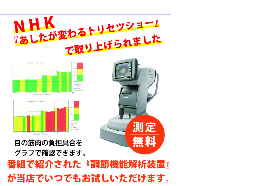 ⅰ.NHKのテレビ番組でも紹介された調節機能解析装置アコモレフで、目の「ピント合わせ機能(調節反応度)」を測定し、グラフ化します。良く見えるだけでなく、楽に見えるメガネの度数をご提案。スマホやPC作業での不調原因をチェック