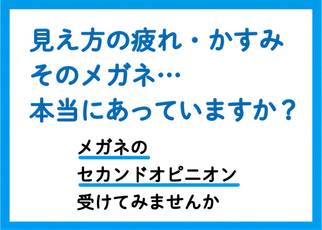 セカンドオピニオンとして、現在のメガネが最適かどうかを専門的にお調べし、より快適な見え方をご提案いたします。