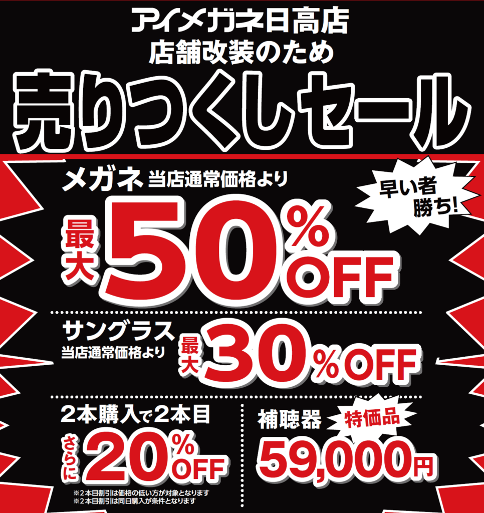 新しく生まれ変わる日高店への準備として、現在の店舗レイアウトでお迎えする最後のビッグセールとなります。 お得なこの機会に、ぜひアイメガネ日高店へお立ち寄りください。