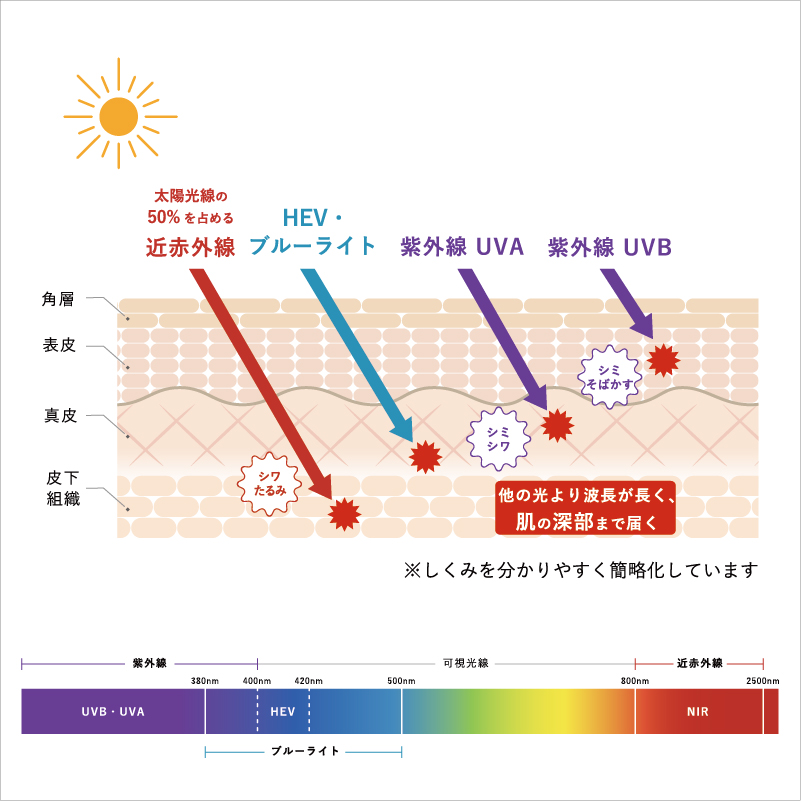地上に届く太陽光の約50%を占める「近赤外線(NIR)」。 紫外線よりも肌の奥深く(真皮層)まで到達し、ハリを保つコラーゲンや筋肉組織にダメージを与えます。 これが、目元の深いシワやたるみの原因となる「光老化」の正体です。 「普通のサングラスでは、この光は防げません」