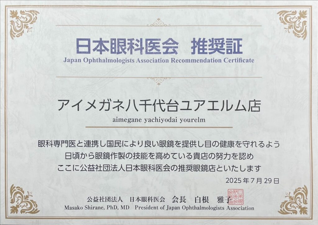 当店は「日本眼科医会推奨眼鏡店」として認定されています!