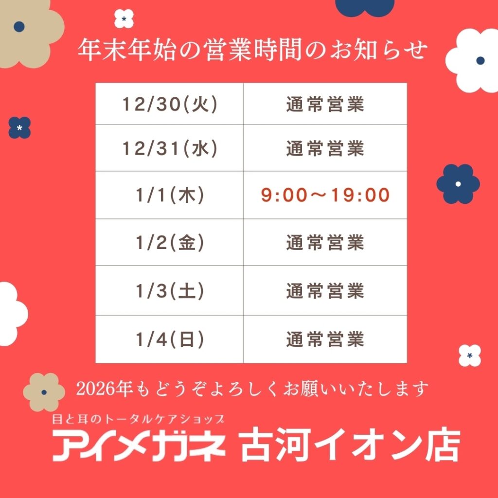 年末年始営業時間のご案内 2025.12.27 アイメガネ古河イオン店 本年も”アイメガネ古河イオン店”をご利用いただきありがとうございました。 当店は年末年始も休まず営業いたします。 営業時間は 10:00 ~ 19:00 です。 (元日のみ 9:00 ~ 19:00 の営業となります) 「NEW YEAR FAIR」開催中の”アイメガネ古河イオン店”を 来年もよろしくお願い申し上げます。 皆様、よいお年をお迎えくださいませ。 前へ 一覧へ