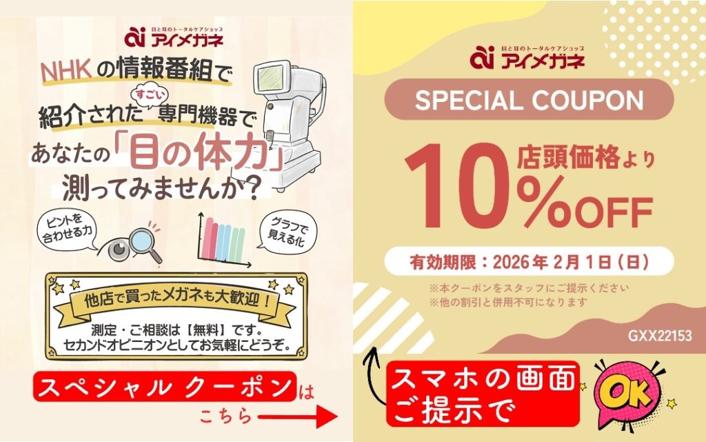 今の見え方に少しでも違和感がある方は、お気軽に”アイメガネ”へお立ち寄りくださいませ。