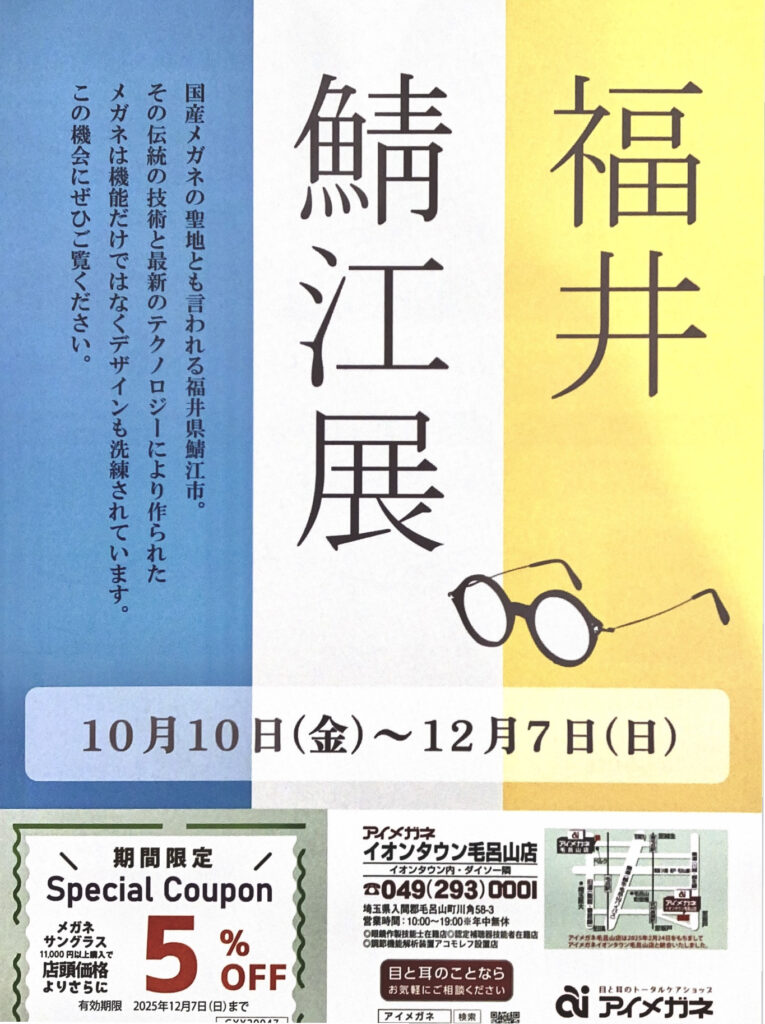 福井鯖江展 開催中 2025.10.26 アイメガネイオンタウン毛呂山店 国産メガネで有名の福井県鯖江市。 現在その日本製のメガネを多数ご用意しております。 HPをご覧になった方は期間限定で5%OFFになります。 ご来店お待ちしております。 前へ 一覧へ