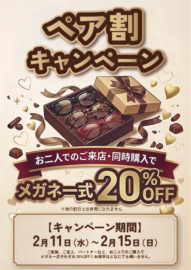期間限定 バレンタイン企画 ペア割 2026.02.10 アイメガネイオンタウン毛呂山店 2月11日(水)~2月15日(日)の5日間限定 メガネ同時購入でそれぞれメガネ一式20%OFF この機会にぜひご来店ください。 前へ 一覧へ
