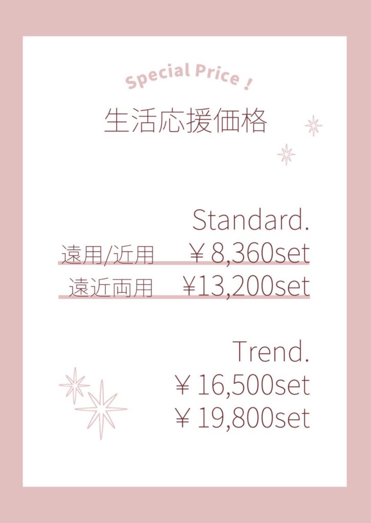 遠く用もしくは近く用メガネなら¥8,360から、遠近両用メガネなら¥13,200から取り揃えております。