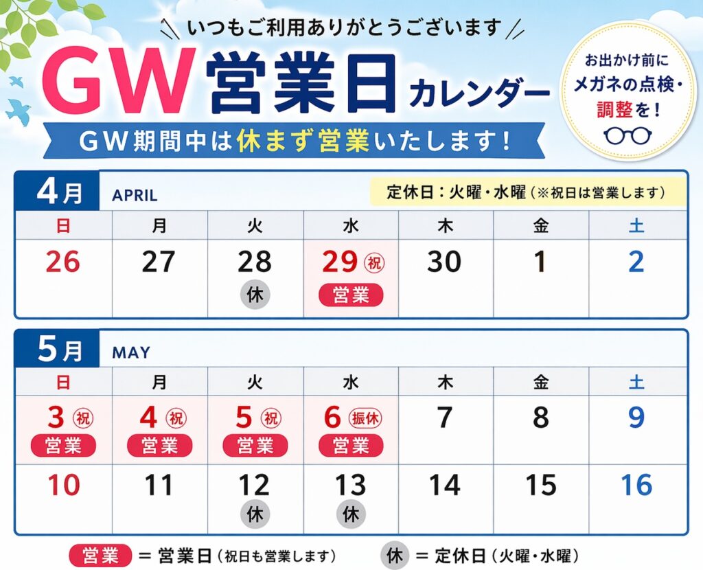 GW期間の営業日について 2026.04.23 アイメガネ羽生店 アイメガネ羽生店は通常、火曜・水曜で定休日をいただいておりますが、祝日と重なる場合は営業いたします。 2026年のGW期間中は休まず営業しておりますので、メガネのメンテナンス、見え方チェックなどお気軽にご利用ください。 前へ 一覧へ