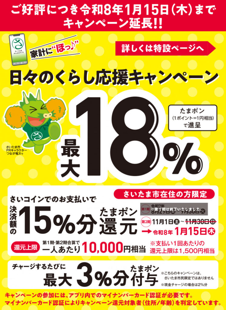 〈さいコイン・たまポン〉キャンぺ-ン 2025.11.06 アイメガネ岩槻駅前通り店 さいたま市みんなのアプリで 「日々のくらし応援キャンペーン」実施中です! 実施期間 第2期:令和7年11月1日(土曜日)から令和8年1月15日(木曜日)までポイント利用期限:令和8年2月28日(土曜日)まで ※予算上限に達し次第終了となりますので、お早めのお買い物をお勧めいたします。 皆様のご来店、心よりお待ちしております。 前へ 一覧へ