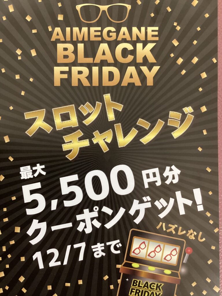 BLACK FRIDAY 始まりました 2025.11.12 アイメガネ川口赤井店 アイメガネでは 2025年12月7日迄 BLACK FRIDAY セール開催中です 期間中にご来店のお客様に最大で5,500円分のクーポンが当たる スロット抽選を実施中です(ハズレ無し)。皆様のご来店お待ちしております。 クーポン券は2025年12月25日迄ご利用いただけます 前へ 一覧へ 次へ