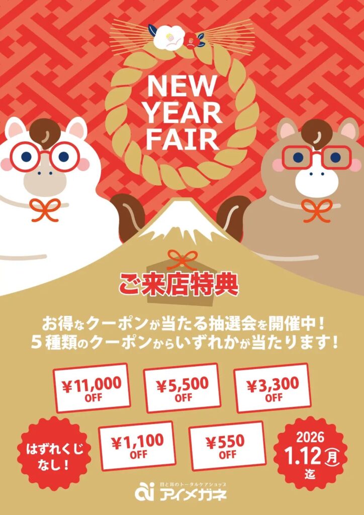 NEW YEAR FAIR 開催中 2025.12.25 アイメガネ川口赤井店 ご来店された皆様に、その場で使える最大11,000円のクーポンが当たる抽選会を開催中です ハズレは有りません 2026年1月12(月)迄開催中です(ク-ポン券は2026年3月1日迄有効です) 皆様のご来店お待ちしております。 前へ 一覧へ