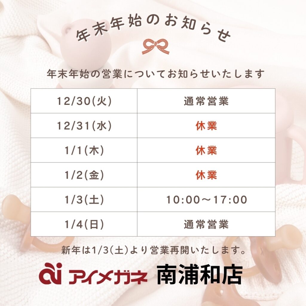 年末年始の営業時間のお知らせ 2025.12.20 アイメガネ南浦和店 2025年もご愛顧賜りまして誠にありがとうございます。 年末年始の店休日、営業時間についてのご案内です。 ご不便をお掛けしますが、宜しくお願い致します。 新年も変わらぬお引き立てのほど、何卒宜しくお願い申し上げます。 前へ 一覧へ