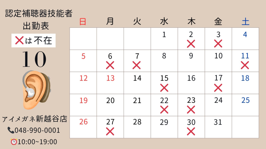 10月の認定補聴器技能者の出勤カレンダーのお知らせです🗓