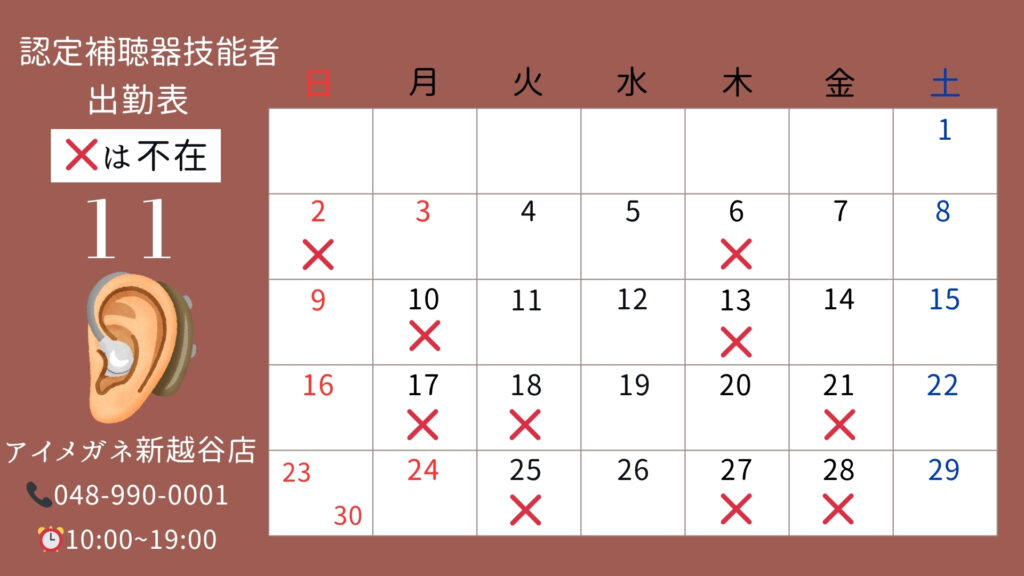 11月の認定補聴器技能者の出勤カレンダーのお知らせです🗓