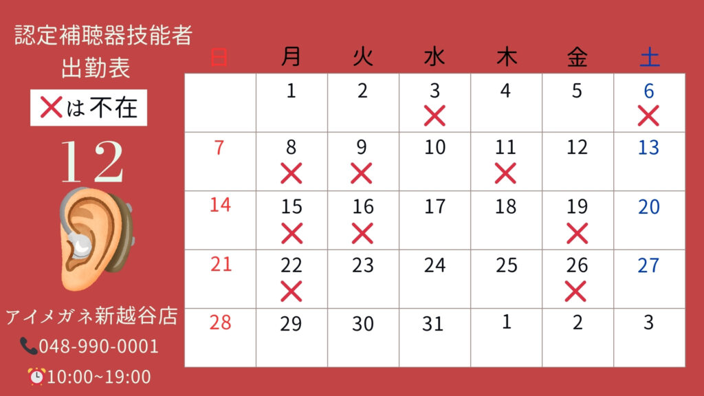 12月の認定補聴器技能者の出勤カレンダーのお知らせです🗓