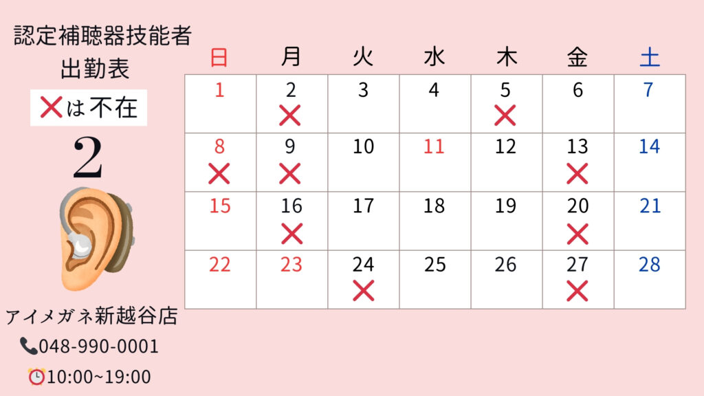 2月の認定補聴器技能者の出勤カレンダーのお知らせです🗓