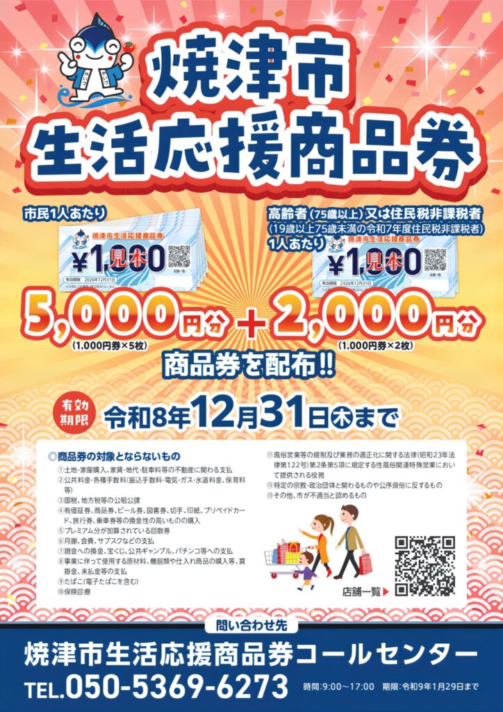 焼津市生活応援商品券ご利用いただけます🐟🎫 2026.04.04 アイメガネ焼津石津店, 静岡県 こんにちは😊✨アイメガネ焼津石津店です👓 皆様に嬉しいお知らせです✉️焼津市生活応援商品券が配布されました🐟🎫当店でもご利用いただけます😳👏 この機会に是非ご活用ください🌸🍃 期間は2026年12月31日(木)まで🗓️ ※商品券のご利用でのお釣りはでませんのでご注意下さい🚨 皆様の御来店をスタッフ一同心よりお待ちしております🌷 前へ 一覧へ