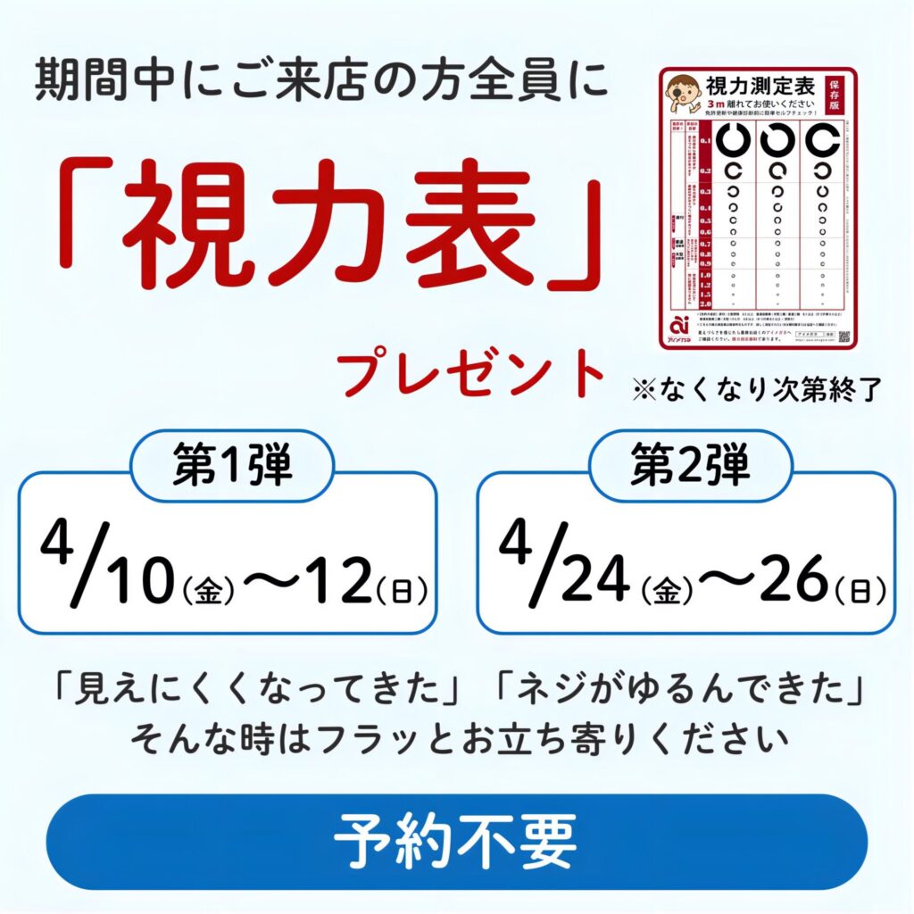 また、4月24日(金)~4月26日(日)までの期間限定でご来店の方全員にお家で使える視力表をプレゼント👁️🗨️👀🎁
