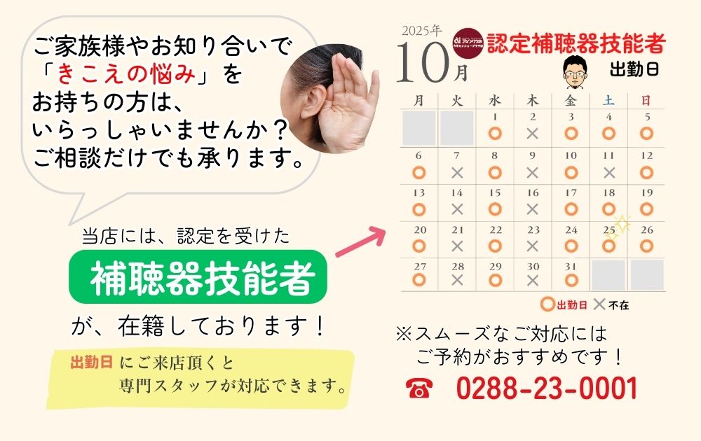 10月認定 補聴器技能者カレンダーです! 2025.09.25 アイメガネ今市センショープラザ店 10月 認定補聴器技能者 出勤日です 認定補聴器技能者 とは・・・ お客様一人ひとりの状態に合わせて、補聴器を選定して調整を行い(フィッティング)、 より快適な「きこえ」をお客様に提供する補聴器の スペシャリストです。上記の出勤日にご予約頂けると、詳しいご説明ができます。 よろしくお願い致します。 前へ 一覧へ 次へ