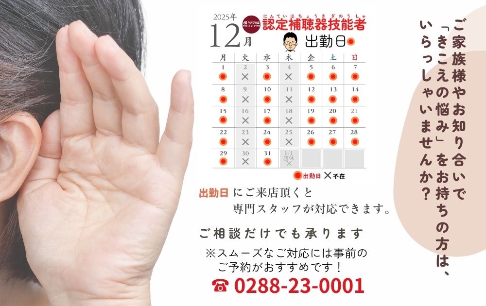 12月 認定補聴器技能者 出勤日です 2025.11.27 アイメガネ今市センショープラザ店 認定補聴器技能者とは・・・ お客様一人ひとりの状態に合わせて、補聴器を選定して調整を行い(フィッティング)、 より快適な「きこえ」をお客様に提供する補聴器のスペシャリストです。上記の出勤日にご予約頂けると、詳しいご説明ができます。 0288-23-0001 よろしくお願い致します。 前へ 一覧へ 次へ