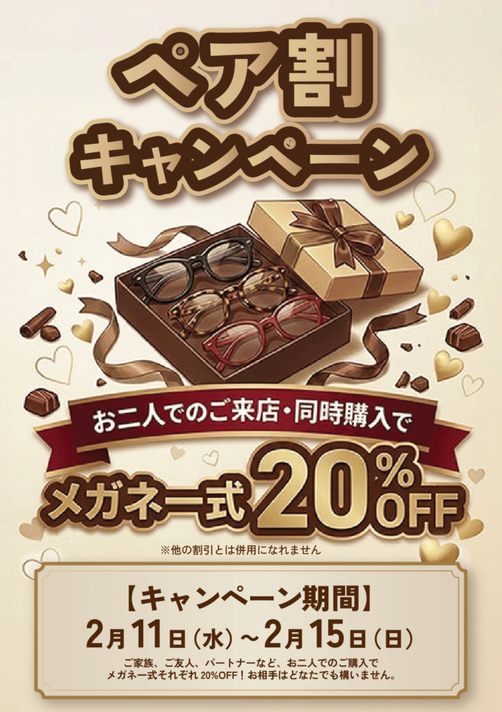 ペア割キャンペーン開催!! 2026.02.10 アイメガネザ・マーケットプレイス東大和店 上記の期間に、メガネ一式をお二人以上でお買い上げいただくと、それぞれメガネが20%OFF!! ご家族、ご友人、パートナーなどお相手はどなたでもかまいません! どのブランドでも対象ですので、この機会に有名ブランドはいかかでしょうか!! ご購入いただいたお客様には、ちょっとしたプレゼントもございますので、 この機会をぜひお見逃しなく!! 前へ 一覧へ 次へ